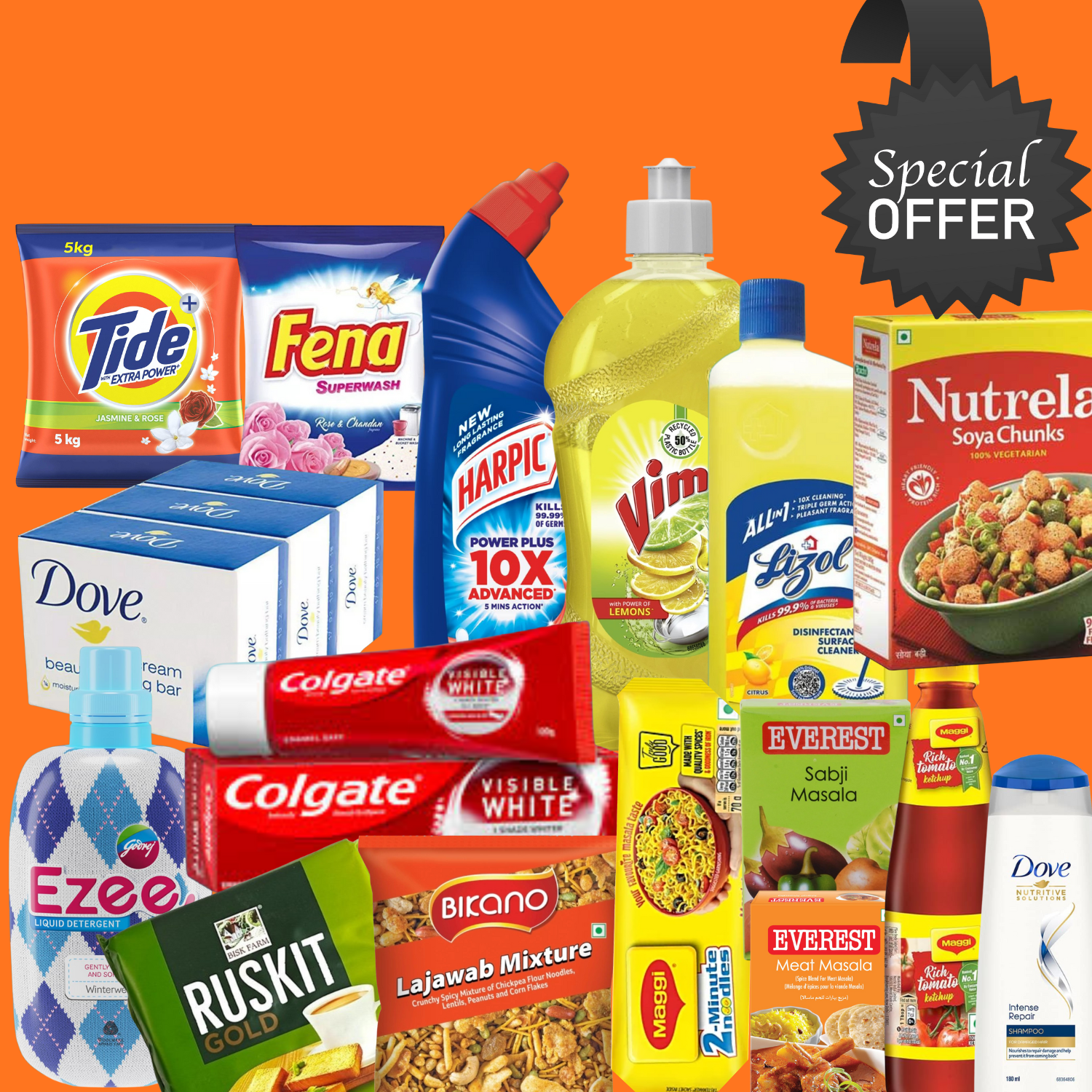 | Name & Quantity | Tide 5 Kg, Fena 5 Kg, Dove Soap 3 pcs 75 gm each, Harpic 1L, Vim 500 ml, Lizol 500 ml, Ezee 500 ml, Colgate Visible White 100 gm, 1 Pack Ruskit Gold Biscuite, Bikano Mixture 500 gm, Maggie 420 gm, Everest Sabji Mashala 100gm, Everest Meat Mashala 100gm, Ketchup 480 gm, Nutrela Soya 1 kg, Dove Shampoo 180 ml |